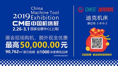 2019CME中國機床展于2月26至3月1日,在國際會展中心(上海)盛大開幕。迪克機床(展位號:2-B16-2)誠邀各位新老客戶參觀指導!主辦方提供優惠活動:凡現場成交訂單(超過1萬的訂單),憑合同+付款憑證(公賬有效)現場抽現金獎,絕對100%中獎!最高50000元